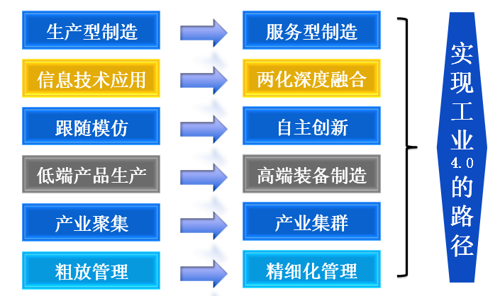 对于工业4.0的战略路径来讲,它主要体现为从生产型制造转化成为服务型制造的过程。我们很容易理解,现在可以利用一些新技术(例如感应器等),为客户工程提供一些增值服务。例如,对于提供桥梁建设的企业,以往只能通过定期查勘才可以判定这个桥梁的钢结构是不是老化了,需不需要进行更新或者加固,但现在你可以通过工业4.0的技术,例如在生产制造的时候,就加上一些感应器,这个制造企业就可以在工厂监控这个桥梁的使用情况,是不是需要派人去维修。美国GE公司为飞机提供零部件的时候,就可以在全球跟踪其零部件的使用情况,如果有潜在风险,是可以提前为客户提供服务的。这些案例都显示以生产型制造转向服务型制造的可能性。
