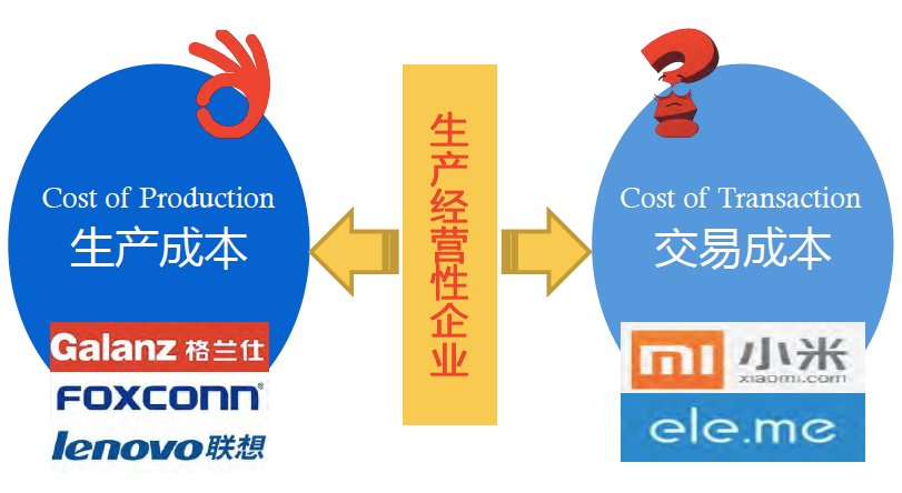 但企业还有另外一个成本,那就是交易成本,有一门学科《交易成本经济学》就是谈这个问题的。交易成本实际上包括内部和外部两种。以企业边界来看交易成本,在企业内部发生的部门与部门之间的协调,那就是内部交易成本;如果企业与其他公司进行交易,这种交易产生的成本就是外部交易成本。当内部交易成本比较高的时候,我们会通过外包来降低成本,例如小米等手机企业,它们自己不生产制造手机,它会让外部的公司帮他制造,原因在于他自己要搭建这个团队后,并通过建设工厂来做这个事情,成本是非常高的。